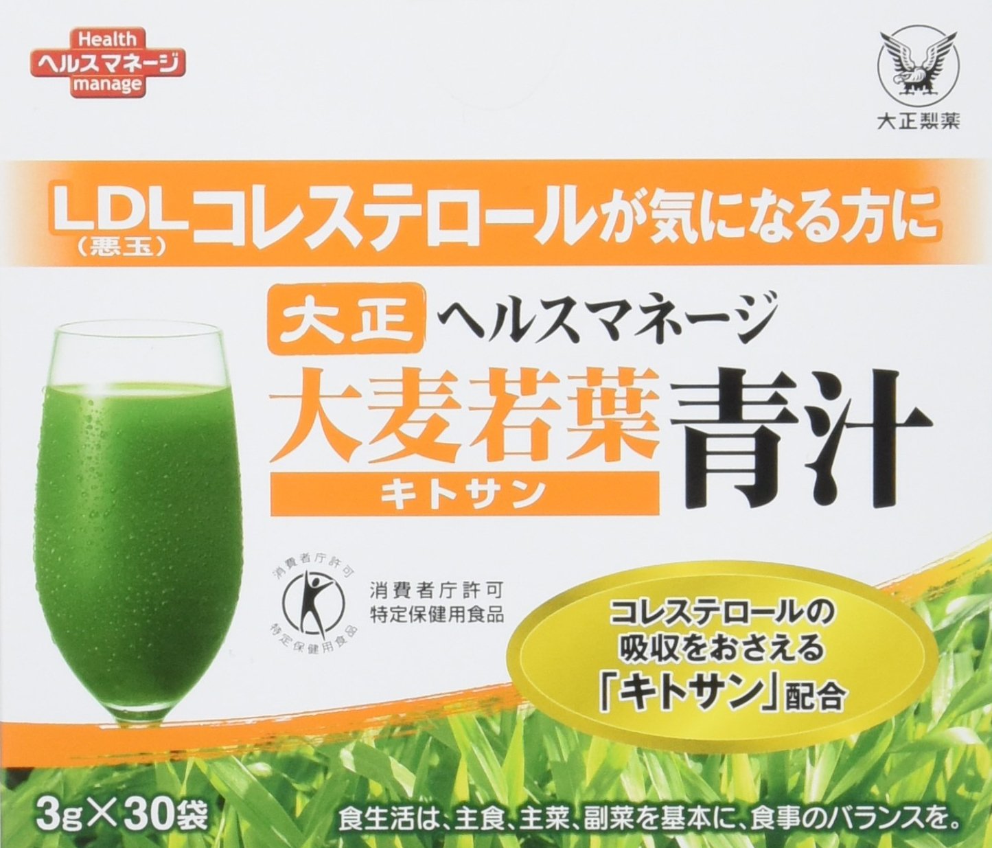 「ヘルスマネージ 大麦若葉青汁<キトサン>」は、コレステロールの吸収を抑えるキトサンを配合した特定保健用食品です。